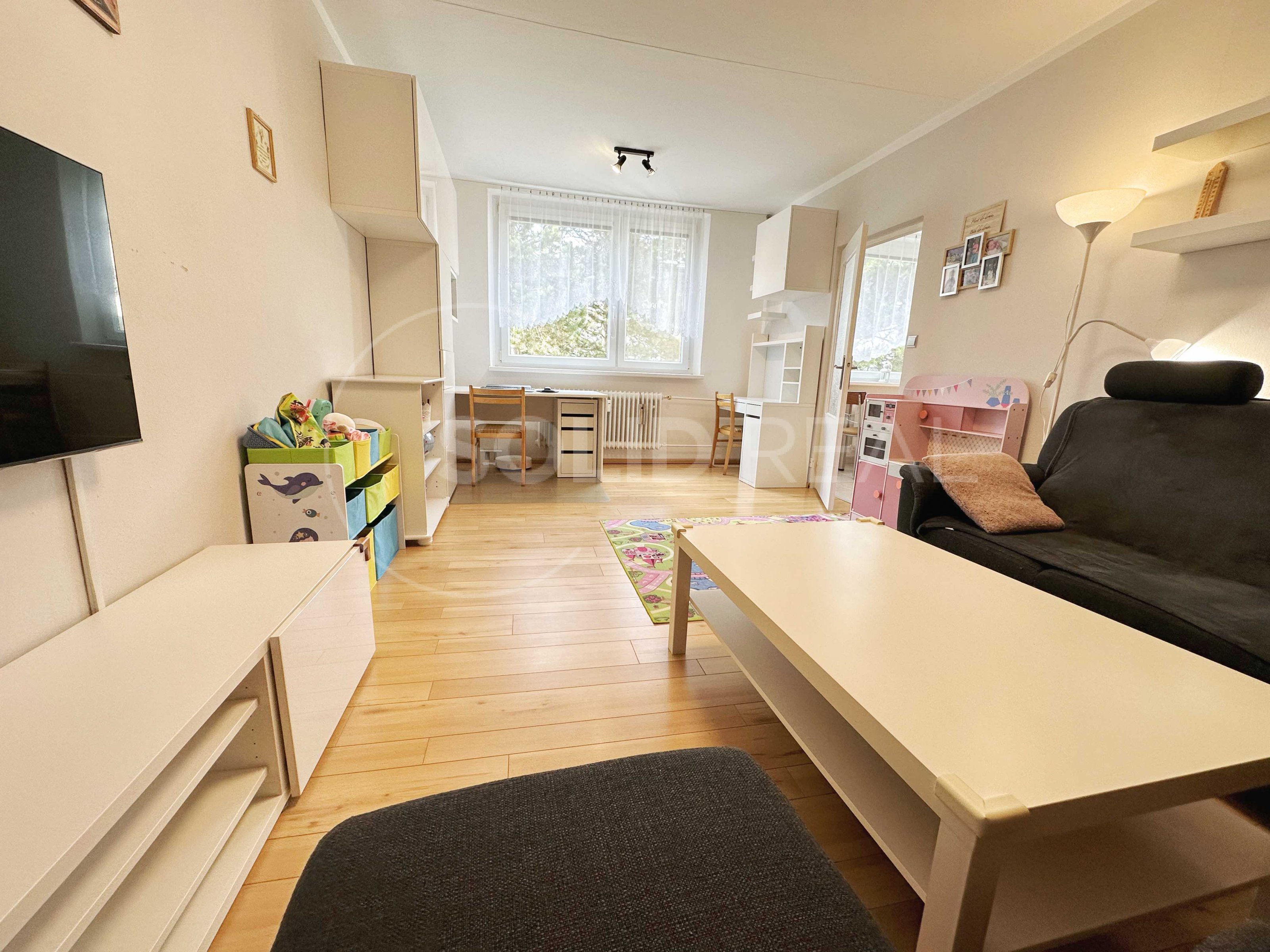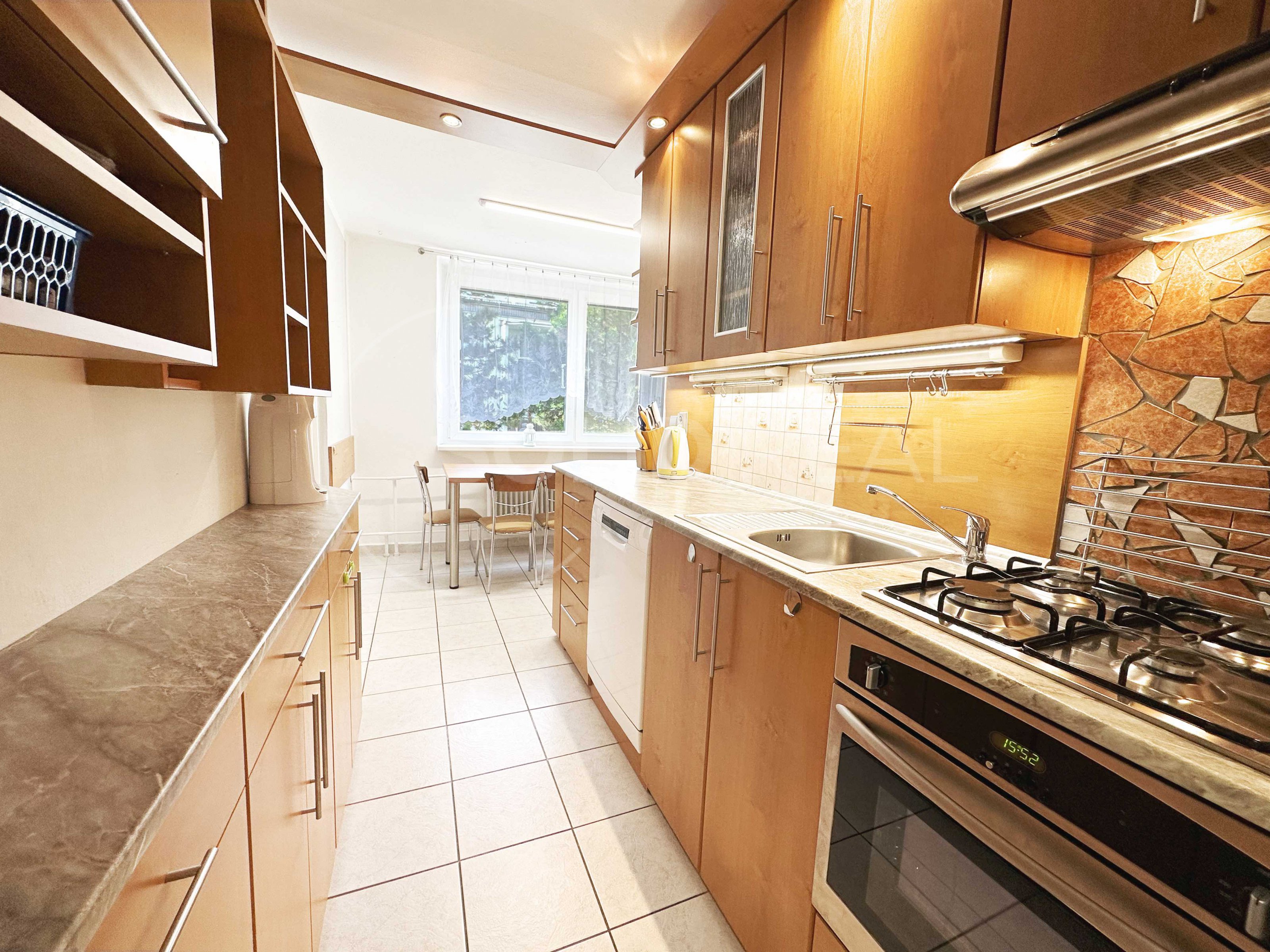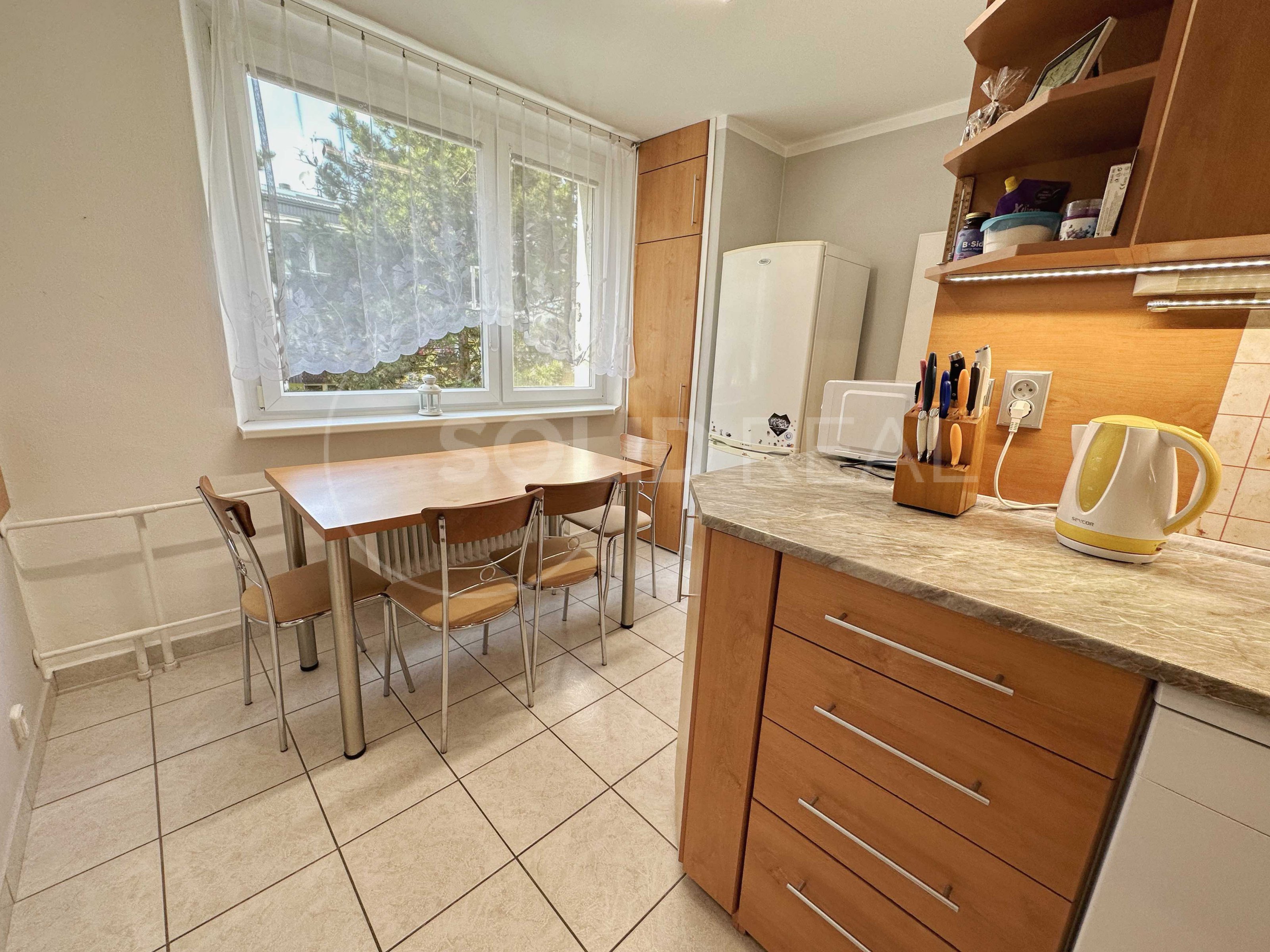 Nabízíme k prodeji prostorný byt o dispozici 3+1 v Tišnově na Dřínové, který se nachází v posledním podlaží (4/4p.) revitalizovaného panelového domu bez výtahu. V rámci revitalizace byla vyměněna okna za plastová, opraveny lodžie, zateplená fasáda s novou omítkou, opravena střecha a proběhla výměna stupaček. Výměra bytu činí 73 m² + pěkná lodžie. Pokoje mají samostatné vstupy. V bytě proběhla částečná rekonstrukce: podlahy v obytných pokojích jsou vyměněny za plovoucí, kuchyně, předsíň, koupelna a toaleta jsou osazeny keramickou dlažbou. V předsíni byly původní skříně nahrazeny velmi praktickou vestavbou. Jádro zůstalo sice umakartové, je však obložené a velmi pěkné. Výstup na lodžii, která je orientovaná na JV je z ložnice, stejným směrem je situovaný dětský pokoj, který je vybaven, podobně jako ložnice, postelemi a nábytkem na míru. Dalším vybavením, které zůstane v ceně bytu je například televize v ložnici, sedací souprava v obývacím pokoji a lednice v kuchyni. Obývací pokoj a kuchyně mají výhled do zeleně, směrem na SZ. Kuchyňská linka zůstane vybavena plynovou varnou deskou, el. troubou a digestoří. Je zde také připraven prostor pro připojení myčky nádobí. K bytu náleží v domě na patře samostatný zděný sklep a další prostory, které rádi ukážeme při prohlídce. Pokud hledáte bydlení v podstatě uprostřed přírody a přitom na dosah kompletně vybaveného města, jste zde na správné adrese: vzrostlé stromy, dětská hřiště, školka, škola kousek, za domem les a kopec Květnice - vítejte v Tišnově!