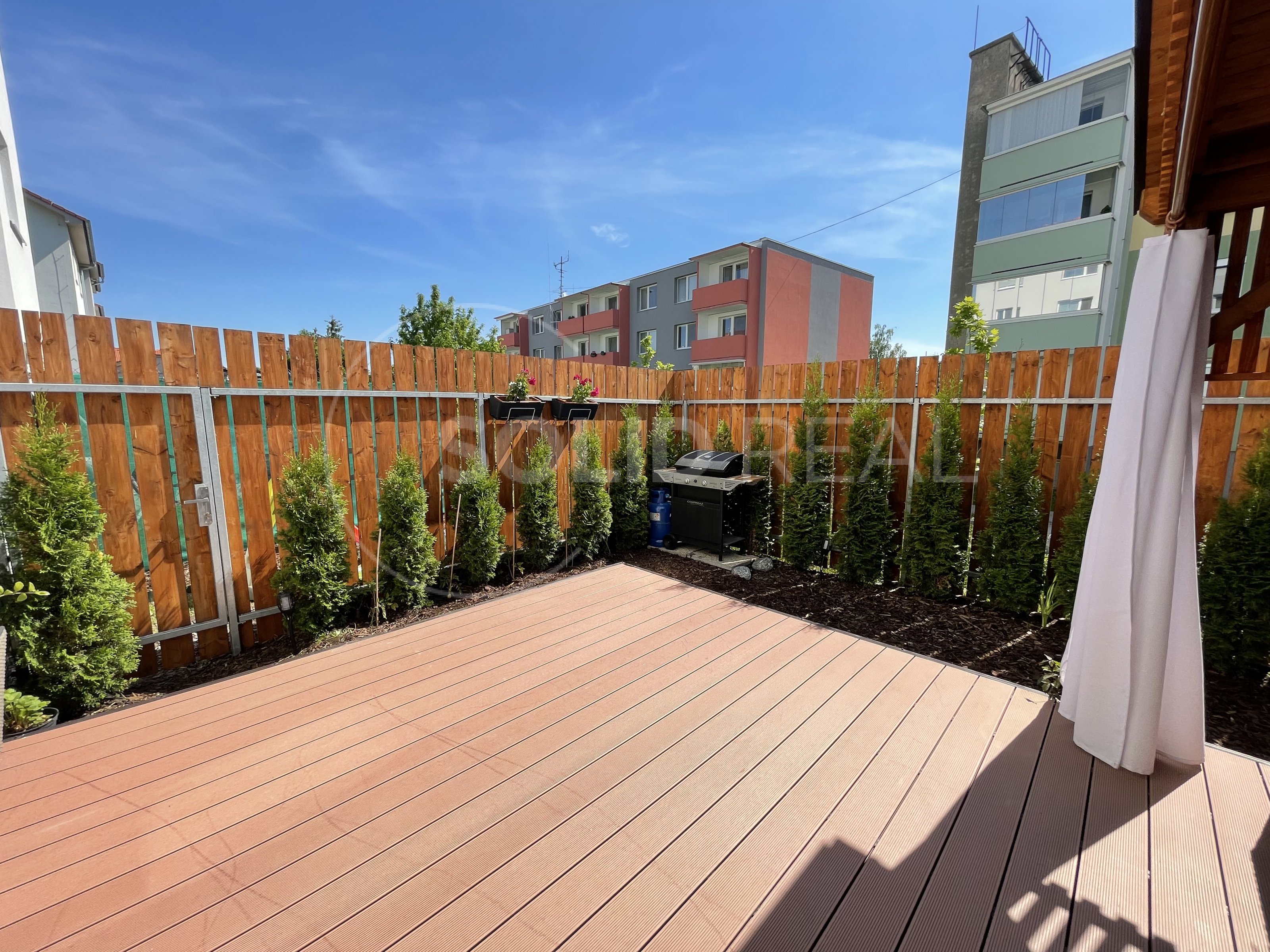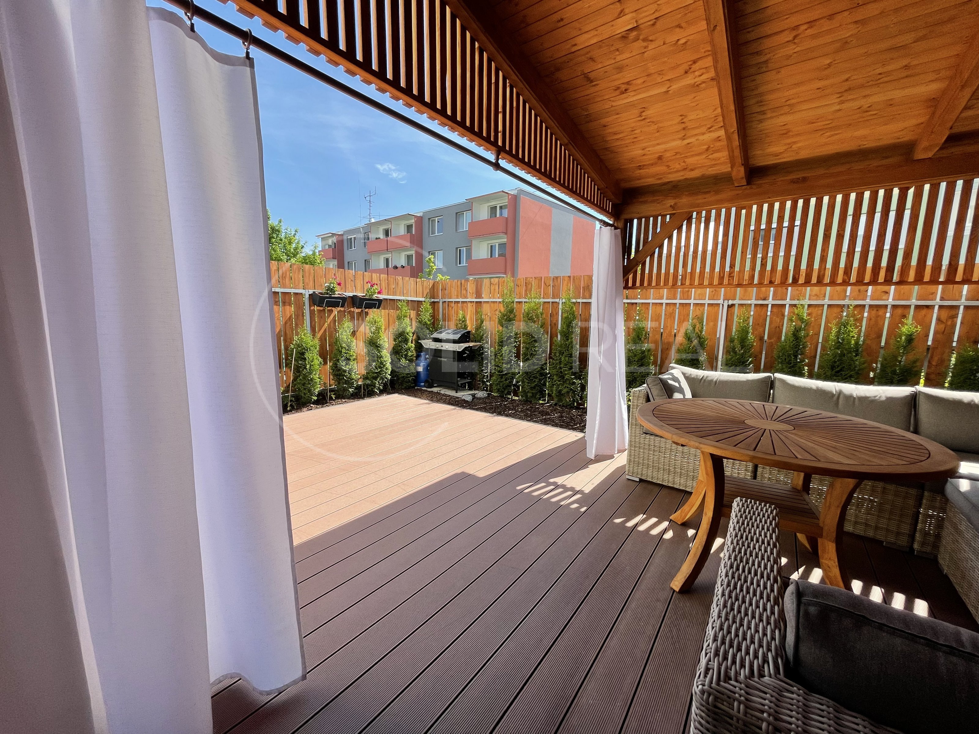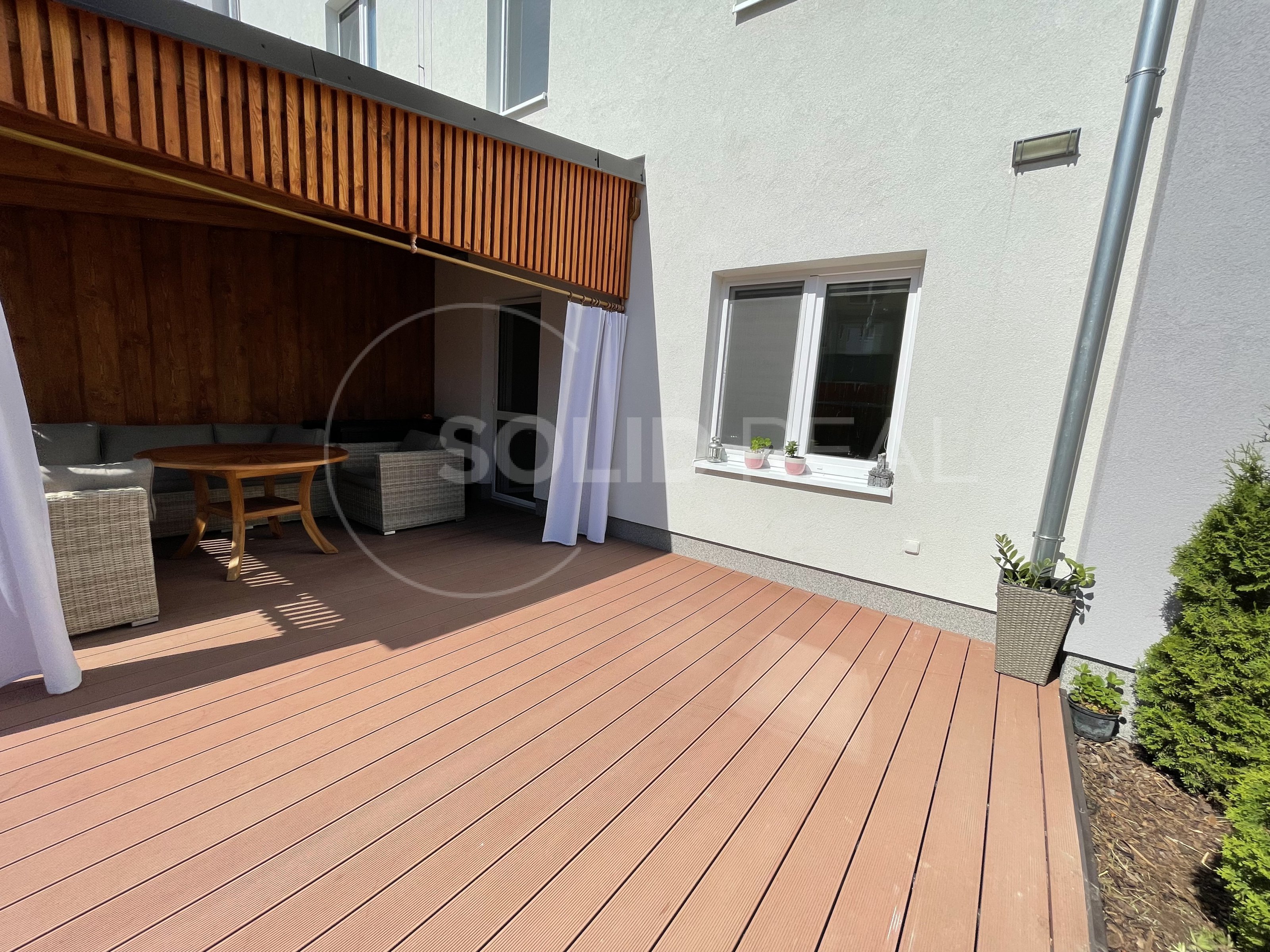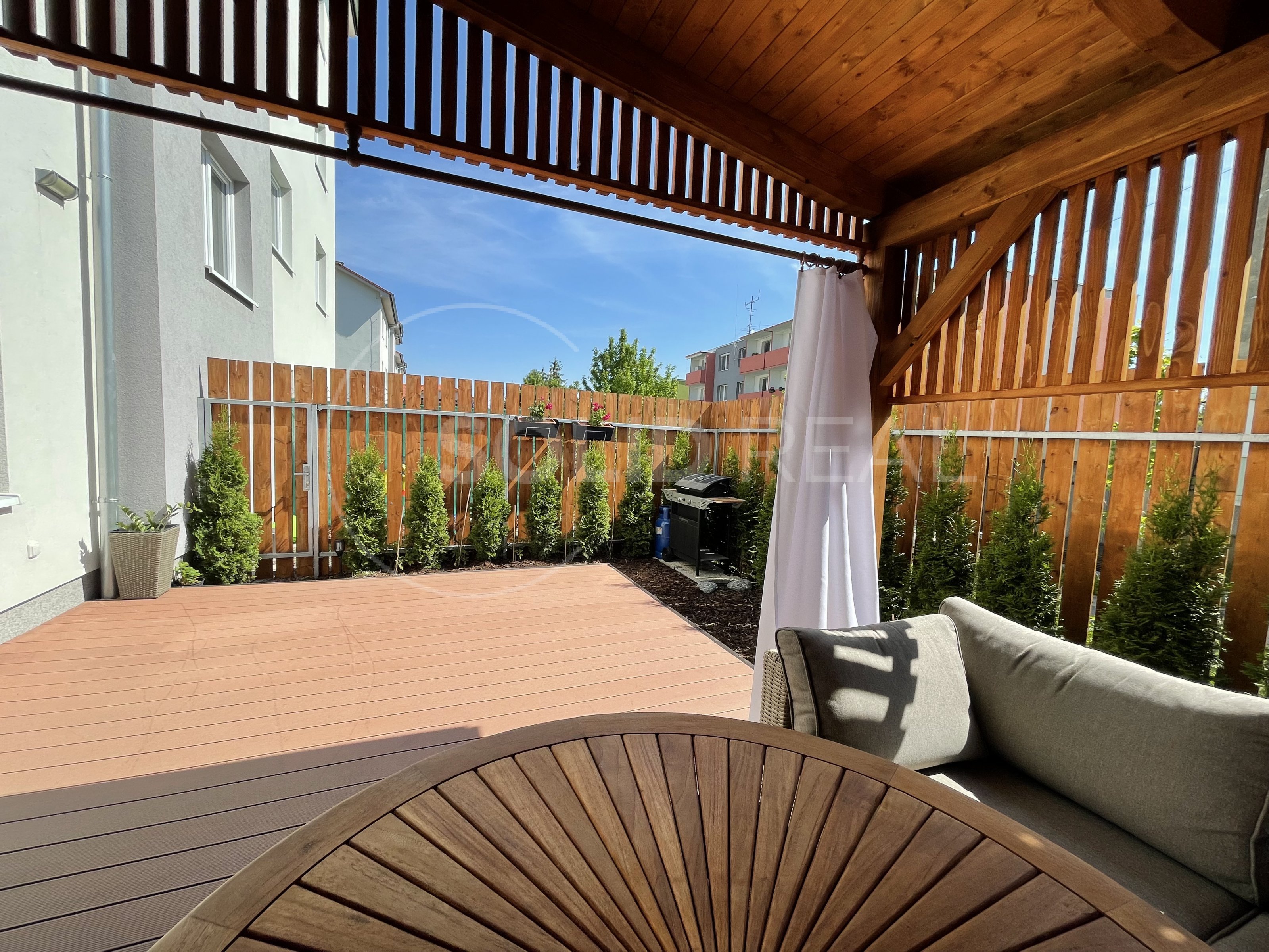 Nabízíme k prodeji nadstandardně vybavený byt v osobním vlastnictví typu 1+kk s velkou terasou, který se nachází v 1.NP/4 novostavby zděného domu bez výtahu. Byt je umístěn v bytovém domě z roku 2019. Dům splňuje požadavky energetické náročnosti třídy "B”- velmi úsporný. Dům je vybaven vlastní plynovou kotelnou, zateplenou fasádou, plastovými okny s izolační trojsklem a dalším. Byt samotný je bezbariérový, umístěný v přízemí bytového domu, ve kterém je i vlastní zděný sklep. Vstup na velkou terasu je možný přímo z bytu, ale i z přilehlého pozemku- terasa je oplocená, s vlastní brankou. Velikost terasy činí 26m², z toho velká část je osazena dřevoplastovou bezúdržbovou podlahou. Část této podlahy je zastřešena pergolou proti dešti a sněhu. Terasa je dále vybavena osvětlením, elektrickými zásuvkami a rozvodem elektřiny i do záhonu. Zbytek terasy představuje zelený pás osázený tújemi. Byt je vybaven zařízením a nábytkem na míru, v kuch. lince jsou instalovány spotřebiče (lednice s mrazákem, myčka nádobí, digestoř, indukční vraná deska, el. trouba, mikrovlnka). Jídelní stůl je řešen jako součást kuchyňské linky. V obývací části designová sedačka, televize a nábytek na míru, na chodbě prostorná vestavěná šatní skříň. Koupelna je osazena závěsnou toaletou a rohovou vanou, dále koupelnovým nábytkem na míru. Podlahy jsou plovoucí laminátové, v koupelně velkoformátová dlažba. Okna jsou vybavena žaluziemi a sítěmi proti hmyzu. Celý byt je napojen na podlahové teplovodní vytápění, které v koupelně doplňuje topný žebřík. Velikost bytu činí 30m². Do bytu zaveden internet a televize optickým kabelem. Velmi nízké náklady na provoz ve výši 1.600,- Kč + internet a televize. Volný od 1.10. Byt je situován na východ, díky čemuž se v letních měsících nepřehřívá, zároveň je umístěn do velmi klidné části lokality a i díky prostorné terase umožňuje polovinu roku žít takříkajíc venku. Parkování před domem. Prohlídka po předchozí dohodě není problém.