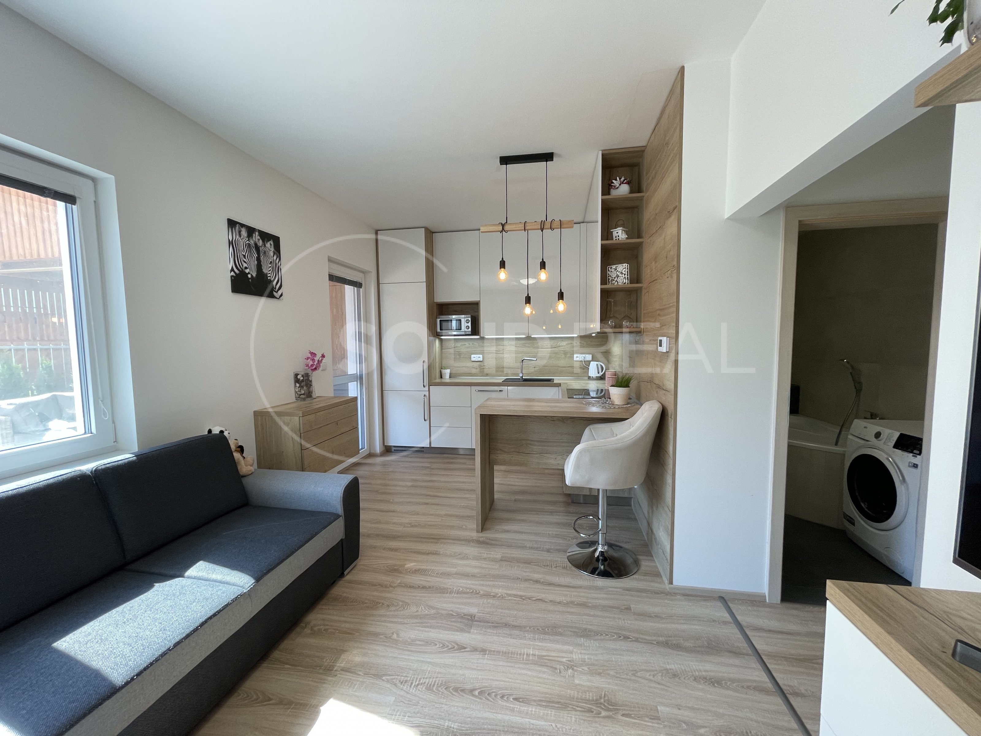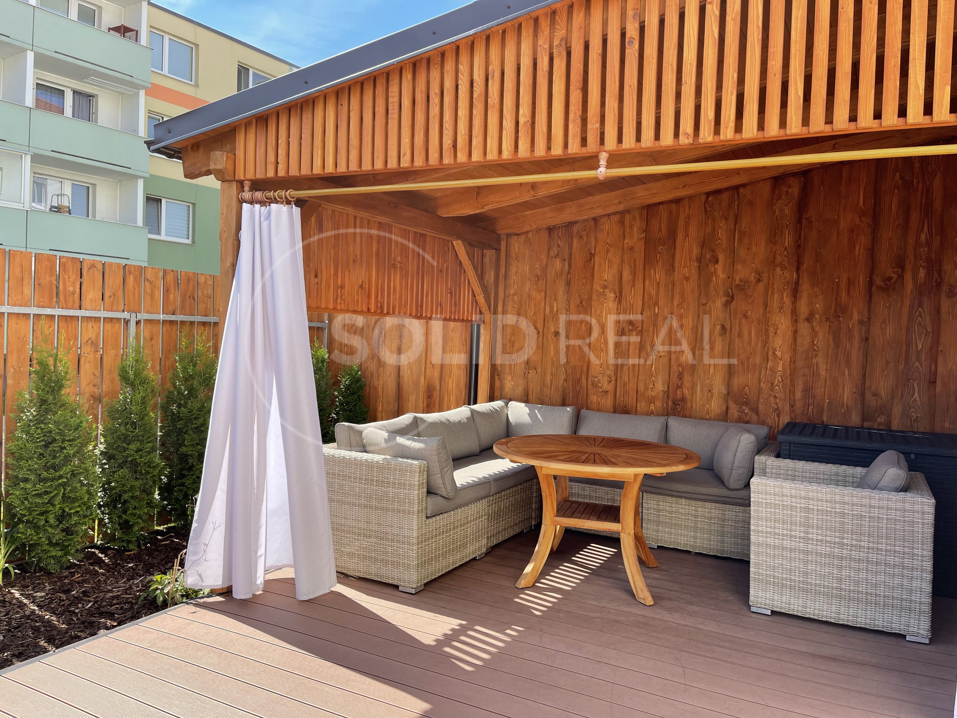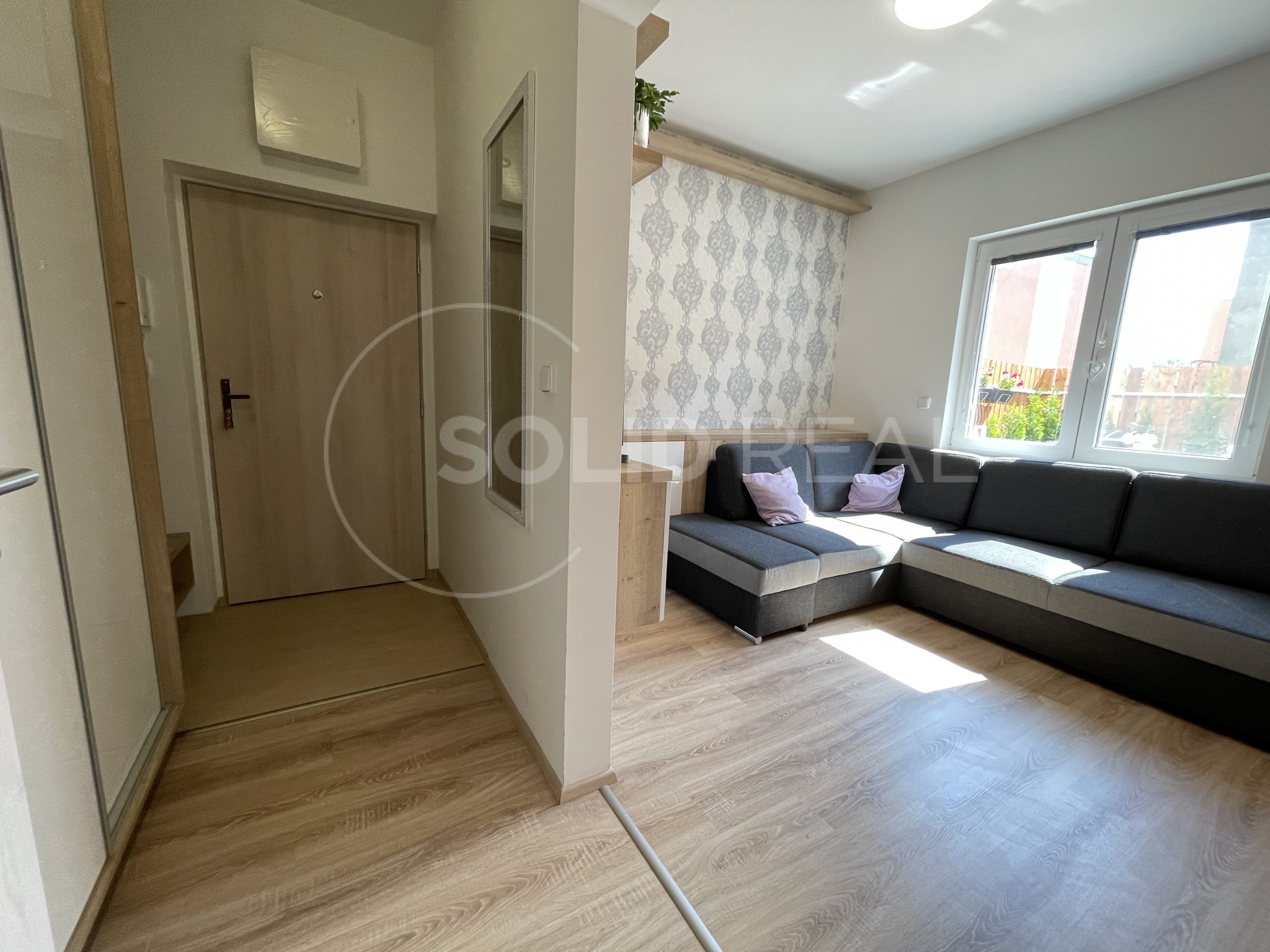 Nabízíme k prodeji nadstandardně vybavený byt v osobním vlastnictví typu 1+kk s velkou terasou, který se nachází v 1.NP/4 novostavby zděného domu bez výtahu. Byt je umístěn v bytovém domě z roku 2019. Dům splňuje požadavky energetické náročnosti třídy "B”- velmi úsporný. Dům je vybaven vlastní plynovou kotelnou, zateplenou fasádou, plastovými okny s izolační trojsklem a dalším. Byt samotný je bezbariérový, umístěný v přízemí bytového domu, ve kterém je i vlastní zděný sklep. Vstup na velkou terasu je možný přímo z bytu, ale i z přilehlého pozemku- terasa je oplocená, s vlastní brankou. Velikost terasy činí 26m², z toho velká část je osazena dřevoplastovou bezúdržbovou podlahou. Část této podlahy je zastřešena pergolou proti dešti a sněhu. Terasa je dále vybavena osvětlením, elektrickými zásuvkami a rozvodem elektřiny i do záhonu. Zbytek terasy představuje zelený pás osázený tújemi. Byt je vybaven zařízením a nábytkem na míru, v kuch. lince jsou instalovány spotřebiče (lednice s mrazákem, myčka nádobí, digestoř, indukční vraná deska, el. trouba, mikrovlnka). Jídelní stůl je řešen jako součást kuchyňské linky. V obývací části designová sedačka, televize a nábytek na míru, na chodbě prostorná vestavěná šatní skříň. Koupelna je osazena závěsnou toaletou a rohovou vanou, dále koupelnovým nábytkem na míru. Podlahy jsou plovoucí laminátové, v koupelně velkoformátová dlažba. Okna jsou vybavena žaluziemi a sítěmi proti hmyzu. Celý byt je napojen na podlahové teplovodní vytápění, které v koupelně doplňuje topný žebřík. Velikost bytu činí 30m². Do bytu zaveden internet a televize optickým kabelem. Velmi nízké náklady na provoz ve výši 1.600,- Kč + internet a televize. Volný od 1.10. Byt je situován na východ, díky čemuž se v letních měsících nepřehřívá, zároveň je umístěn do velmi klidné části lokality a i díky prostorné terase umožňuje polovinu roku žít takříkajíc venku. Parkování před domem. Prohlídka po předchozí dohodě není problém.